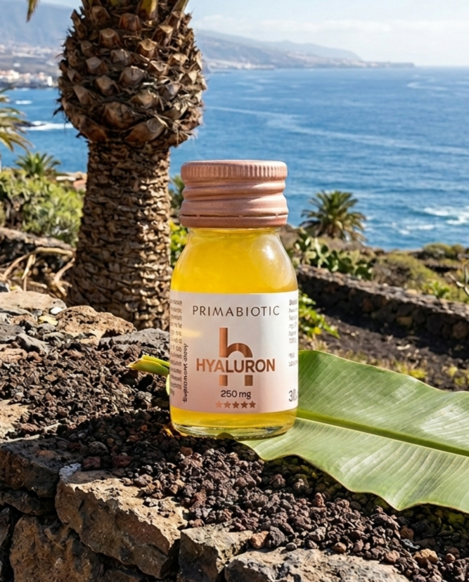 Hyaluron is Primabiotic's answer to lasting skin hydration — from the inside out. Each 30ml shot contains 250 mg of high-molecular-weight hyaluronic acid paired with Coenzyme Q10, vitamin C, biotin, and zinc. Together, they deeply hydrate, smooth fine lines, and support your skin's natural regeneration process. Mango-flavored, vegan, no added sugar or preservatives, only 10 kcal per serving.
