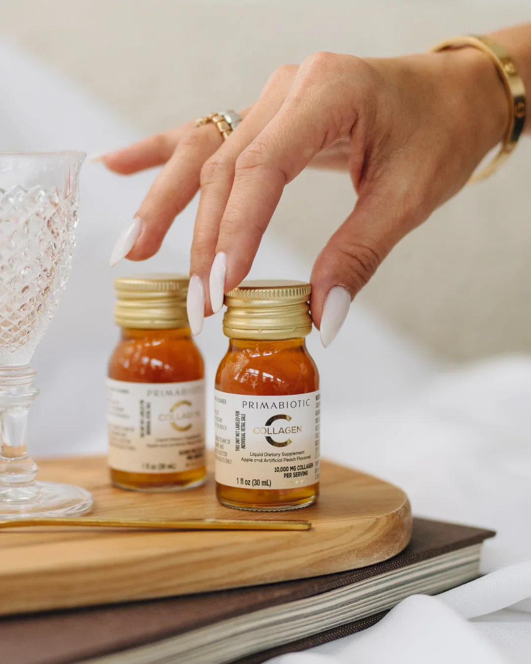 Primabiotic Liquid Collagen delivers 10,000 mg of premium hydrolyzed collagen in a single 30ml shot — absorbed up to 95% more effectively than capsules or powders. Enriched with 12 vitamins, it works from within to firm your skin, strengthen hair and nails, and support your joints. One shot. Forty-five calories. Real results you can see in the mirror.
